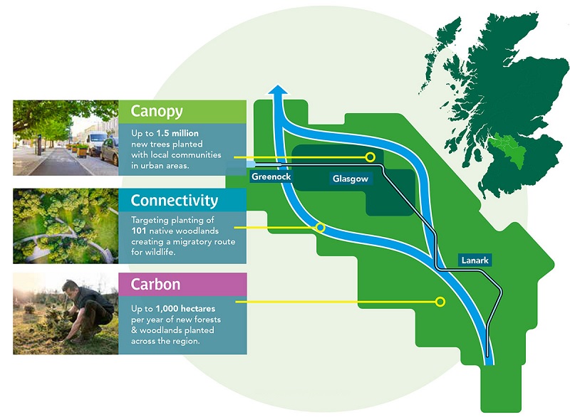 Glasgow, la segunda ciudad más importante de Escocia, se ha comprometido a plantar en los próximos años 18 millones de árboles, diez por habitante. Esta iniciativa forma parte de su plan de adaptación y mitigación del cambio climático ante el riesgo creciente de olas de calor, tormentas e inundaciones. La iniciativa del Clyde Climate Forest (CCF) quiere incrementar en un 20% la superficie arbolada de la ciudad, con especial anteción a las minas abandonadas de la periferia y las zonas más pobres como Easterhouse o Castlemilk. Además, busca consolidar como bosque al menos una quinta parte de la superficie rural en la próxima década.